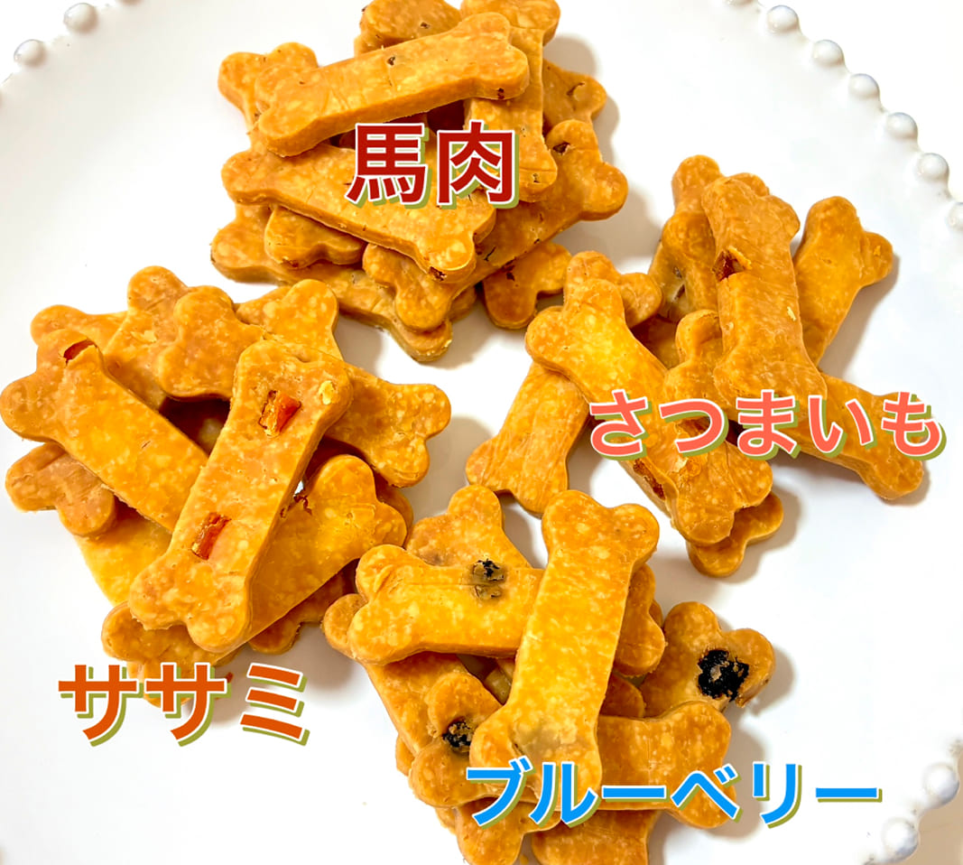 ベースは「国産プレミアム米粉・卵・オリーブオイル」人間も食べられる安心素材を使用したクッキー生地に、4種類のフレーバーをアソートしました。
