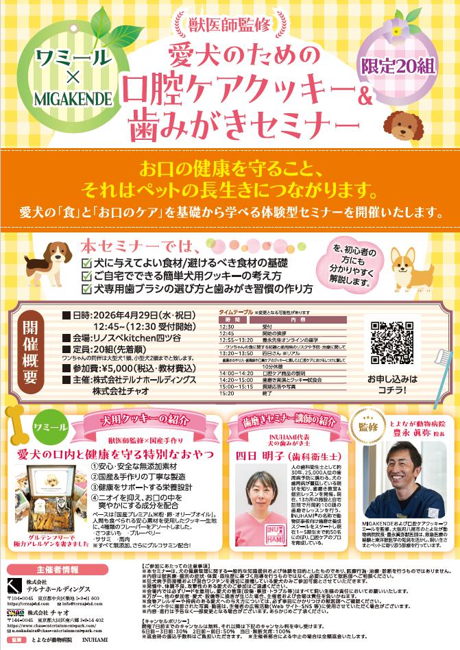 【2026年4月29日(水/祝)開催】「愛犬のための口腔ケアクッキー&歯みがきセミナー」のお知らせ